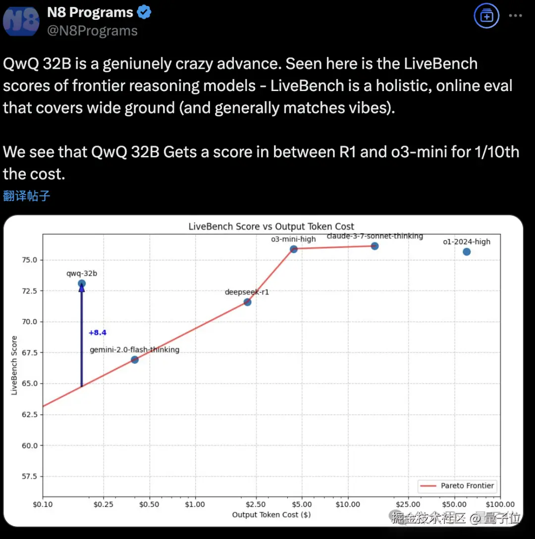 如果将 QwQ 32B 添加到代码能力与输出 token 成本的图表中,可以看到它以约 1/10 的成本达到了 DeepSeek-R1 与 o3-mini-high 之间的性能。