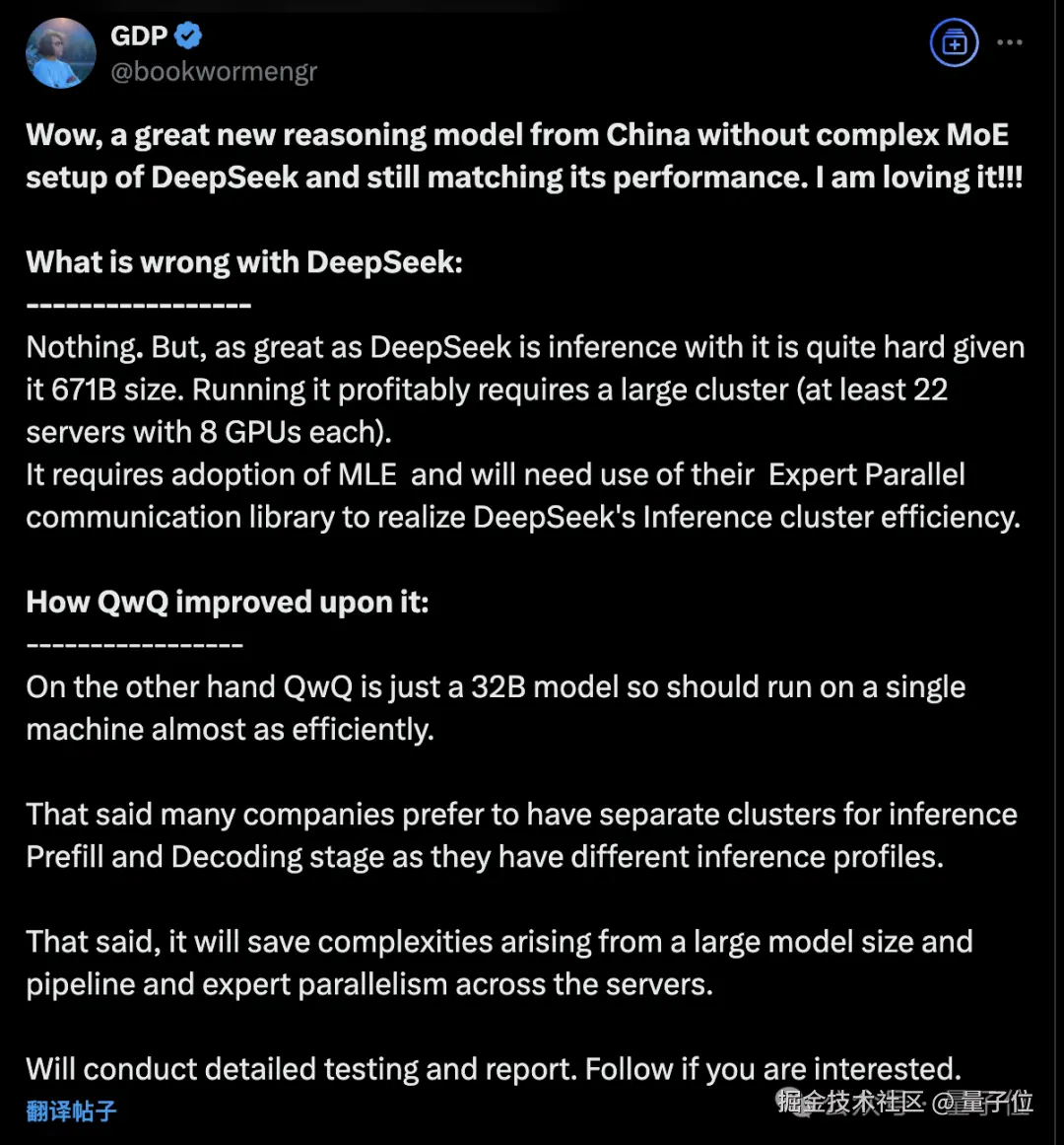 …… 另一方面 QwQ 32B 可以减少由流水线并行、专家并行带来的复杂性。