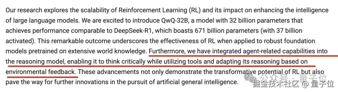 目前 QwQ-32B 还未放出完整技术报告,官方发布页面对强化学习方法做了简短说明: