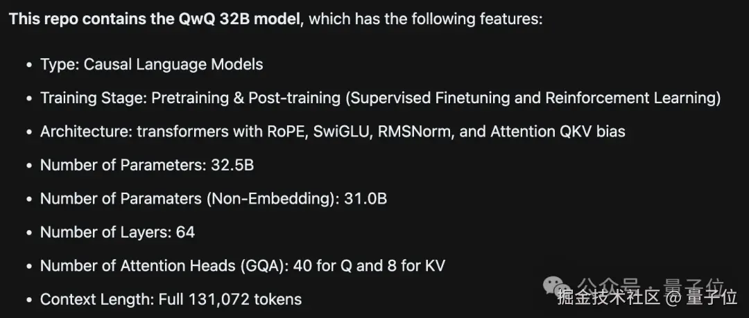 此外在 ModelScope 页面,还可以看出 QwQ 32B 是一个密集模型,没有用到 MoE,上下文长度有 131k。