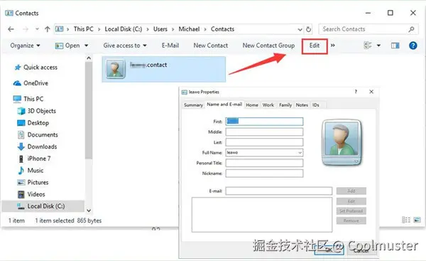 步骤6.单击您要编辑的文件,然后点击工具栏中的“编辑”。您可以修改或添加联系人照片,还可以编辑姓名、头衔、昵称、电子邮件、家庭、住所、工作、注释和 ID 等详细信息。最后,单击“确定”保存Windows联系人中的更改。