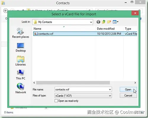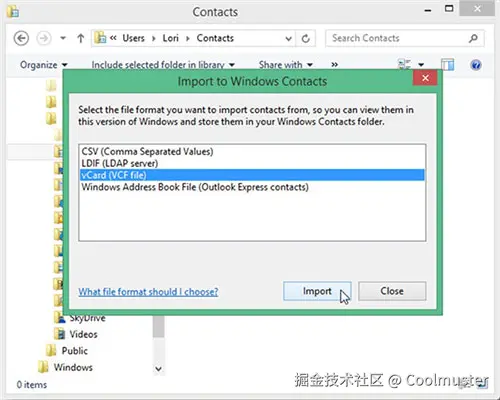 步骤3.在弹出的面板中,选择“vCard(VCF文件)”,然后单击“导入”。导航到包含 VCF 文件的文件夹,选择它,然后单击“打开”。