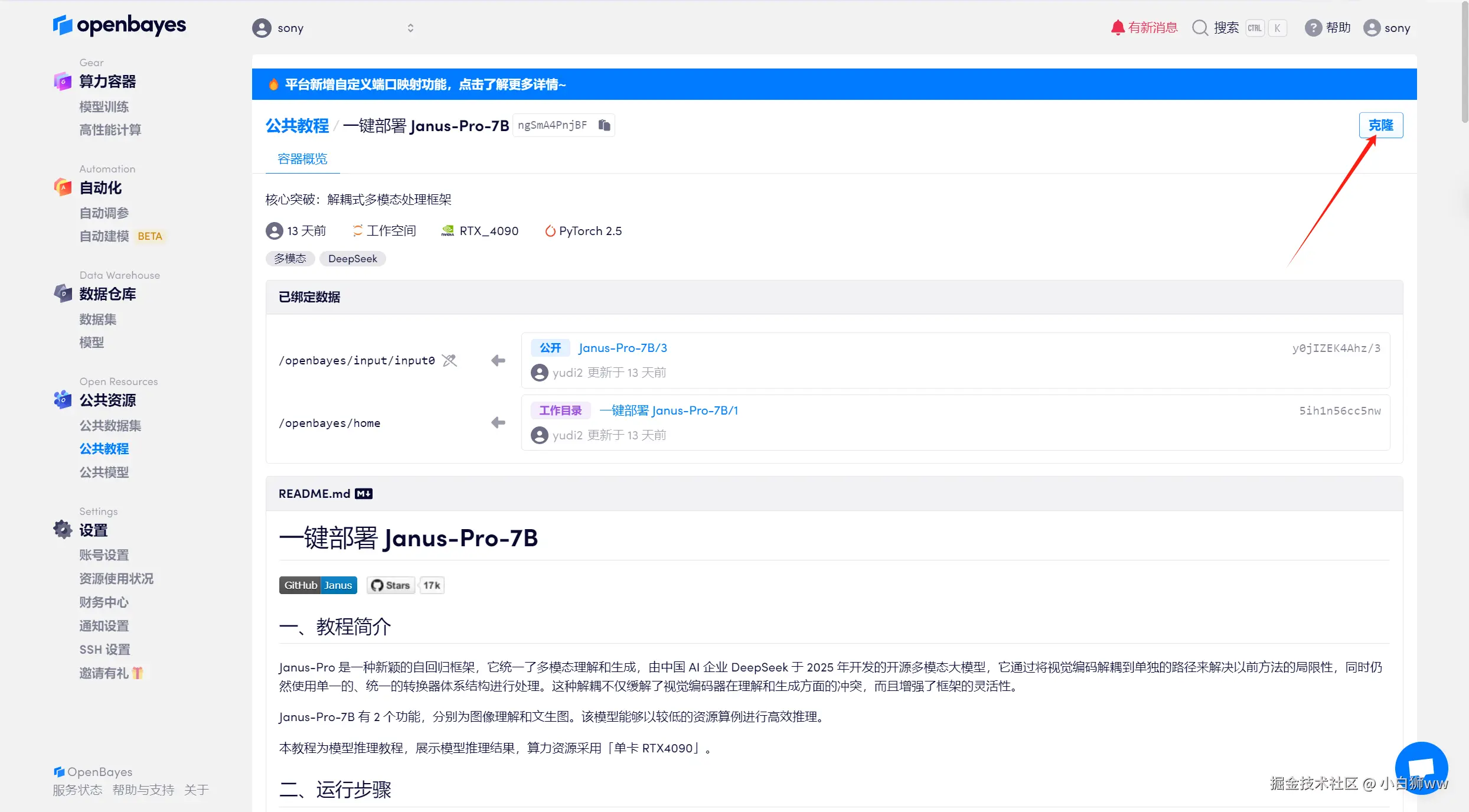 登录 OpenBayes.com,在「公共教程」页面,选择键部署 「一键部署 Janus-Pro-7B」教程。