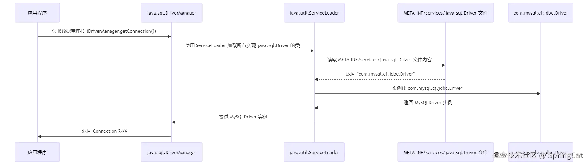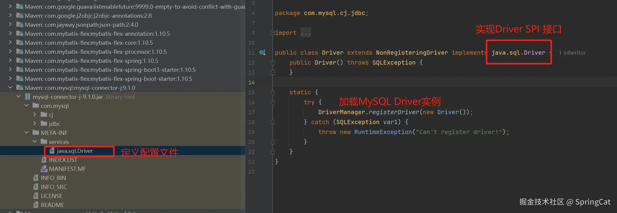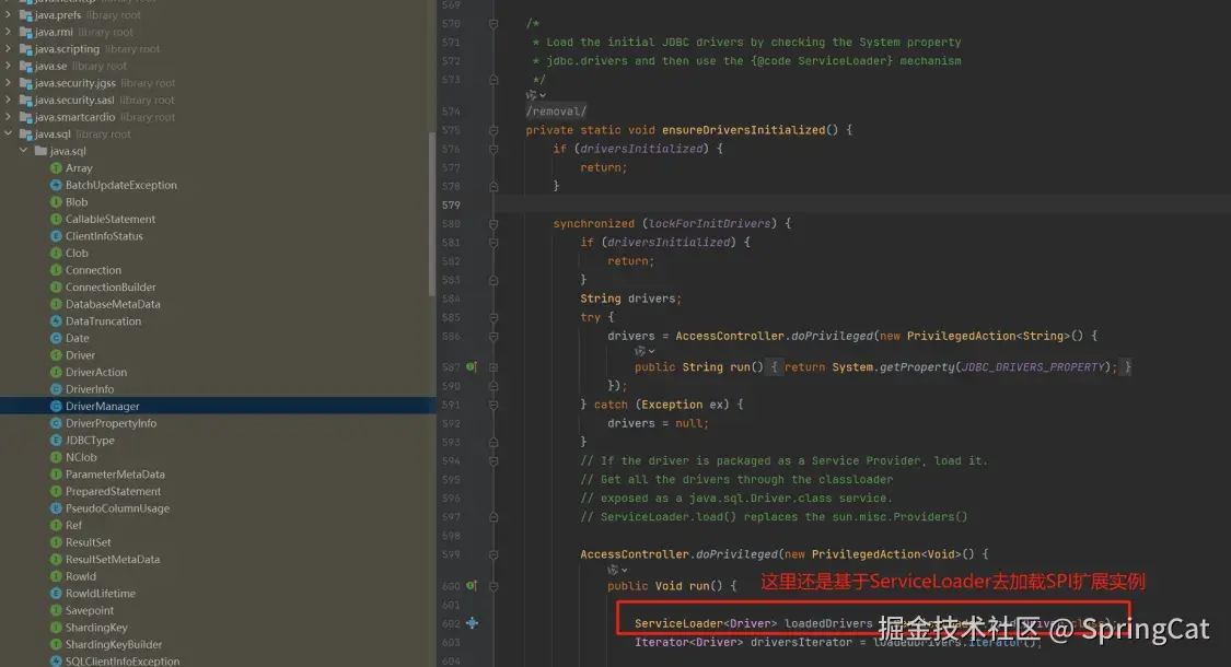 以 java.sql.Driver 为例, 就是 JDBC(Java Database Connectivity)规范中定义的一个 SPI 接口,用于与数据库进行交互。MySQL 和 Oracle 等数据库厂商通过实现这个接口来提供自己的 JDBC 驱动程序,使得Java 应用可以连接、查询和操作这些数据库。