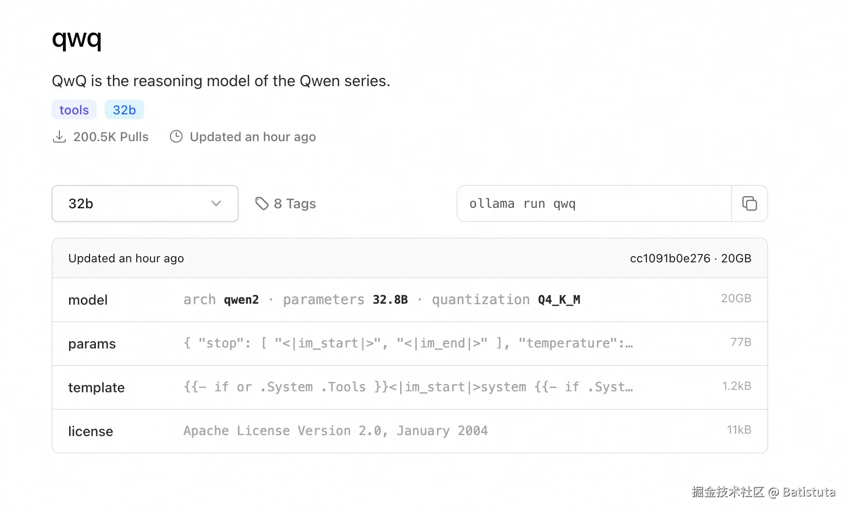 ollama也第一时间发布Q4_K_M的量化版本,ollama.com/library/qwq,大家配置够的话,可以本地部署体验一下,不清楚怎么本地部署的可以看看《5分钟手把手系列(一):使用Mac Book Pro本地部署大模型(Ollama+Llama3.1_8B+Docker+OpenWebUI)》