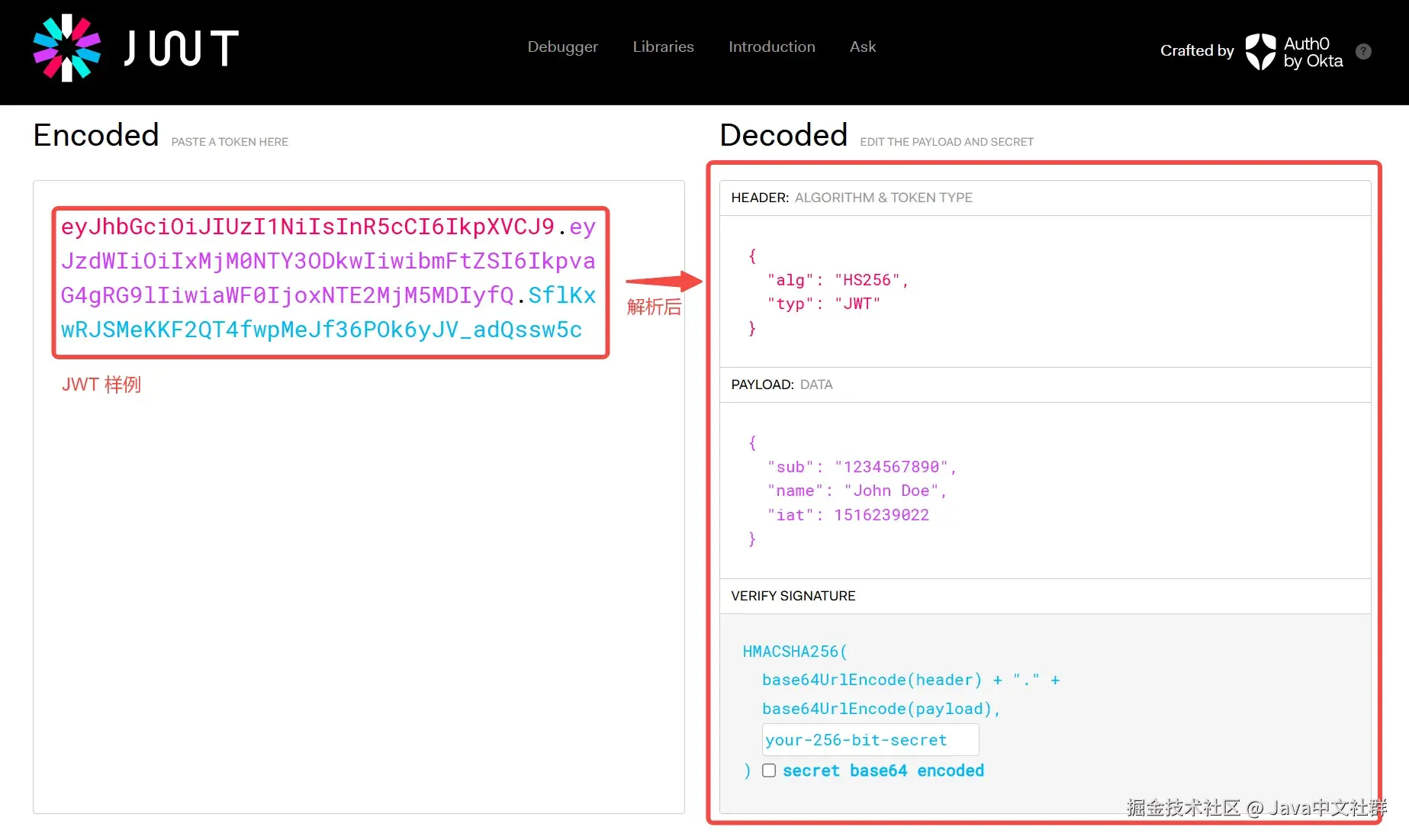 - 加密算法:例如 HS256(HMAC SHA-256)、RS256(RSA SHA-256)等。
