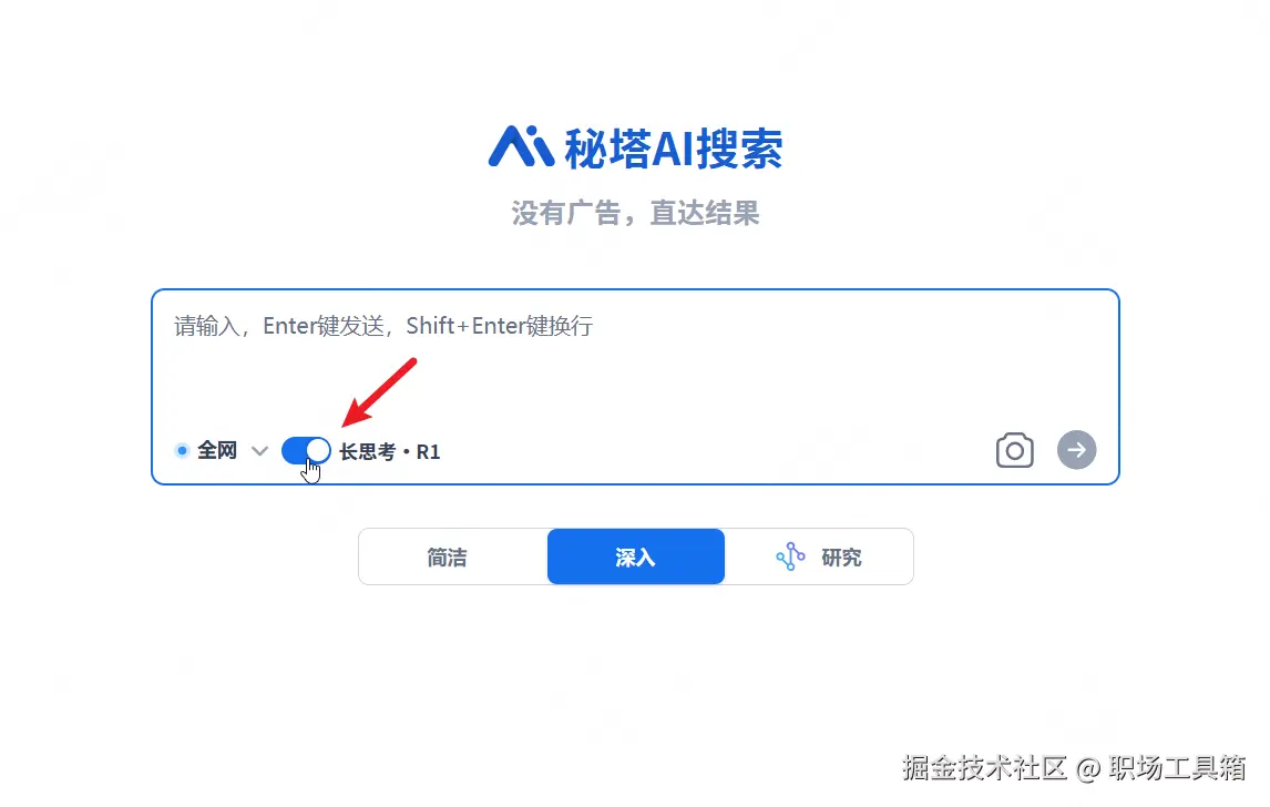 秘塔AI搜索,是一款对标Perplextiy的AI搜索工具,近来它同样在产品中集成了DeepSeek大模型,在使用AI搜索之前,开启“长思考·R1”,就能直接使用DeepSeek。
