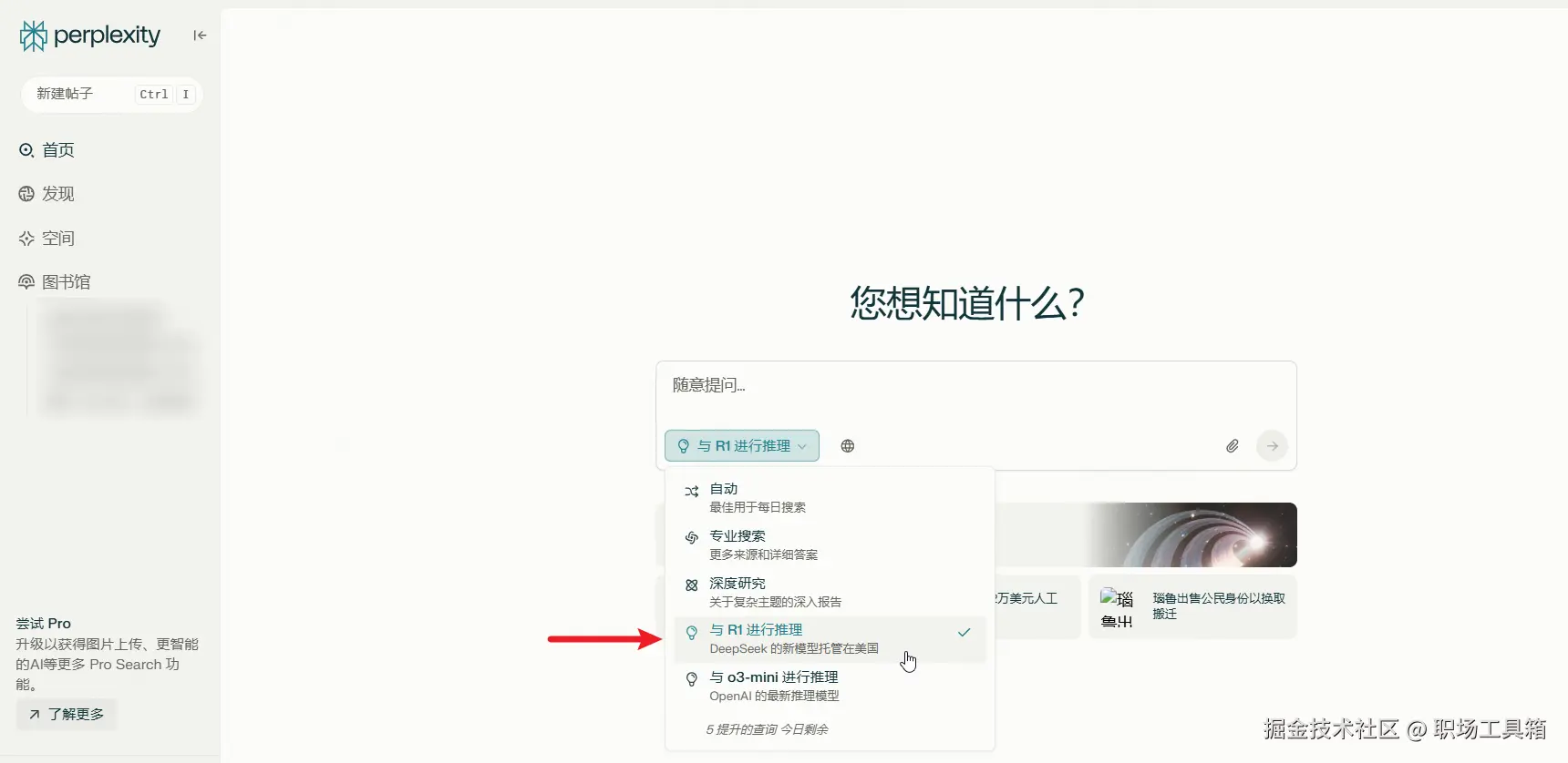 如今Perplexity也在产品内部署DeepSeek R1模型,点击输入框左下角的选项,切换为“与R1进行推理”,就能在Perplexity中使用DeepSeek。