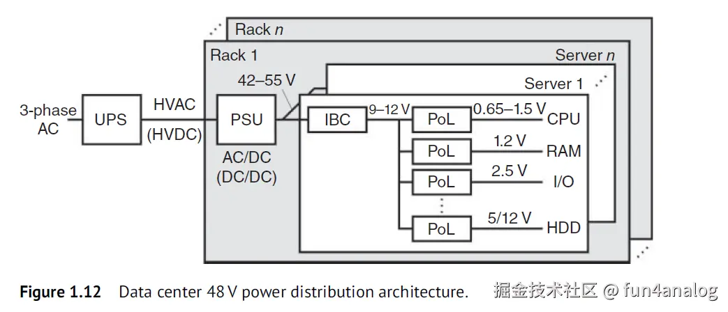 一个Rack功率为10kW - 60kW. 包括 power supply unit (PSU), intermediate bus converter (IBC), point-of-load DC–DC converters (PoL). Rack rail 电压也从12V有趋势增加到48V. 这样能4倍减小输入电流, 即16倍 走线功耗. 但是48V转1V是个挑战.