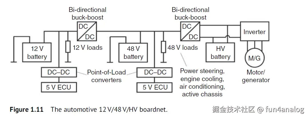 电动车智能化加重了功率. 因此目前趋势是board net从12V提高到48V, 提供8–15 kW. 这样走线电流更小, loss更小. 48V board net变化范围为24-54V.