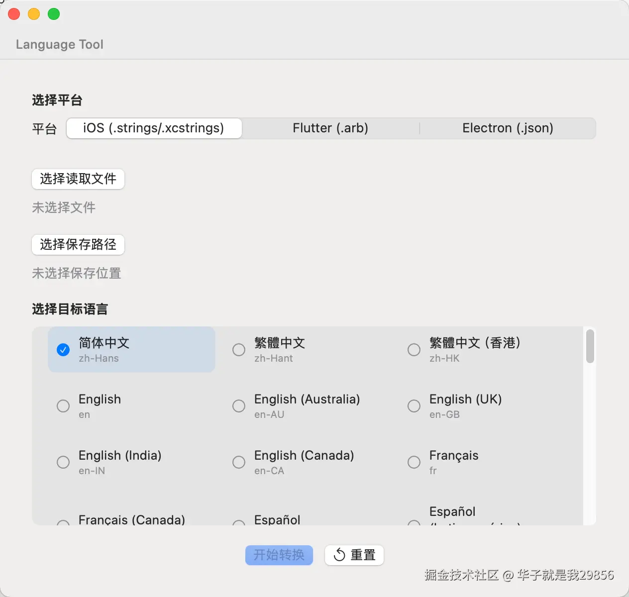 Language Tool 是一个 macOS 应用程序,用于自动化生成多平台的多语言本地化文件。支持 iOS、Flutter 和 Electron 项目的本地化文件生成。