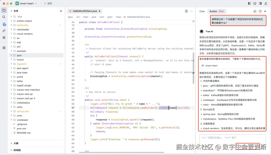 此时我们可以看到 Trae 读取了我当前整个工作空间的代码数据,并进行分析后,给出了对应的项目总结。