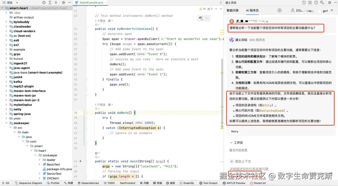 IDEA 打开该仓库后,使用通义灵码的“AI 程序员模式”来问一个简单的问题:“请帮我分析一下当前整个项目空间中所有项目的主要功能是什么?”
