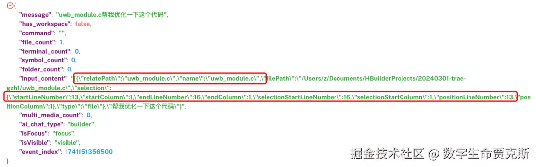 可以看到最终 input_content 参数中的内容,实际只是携带了当前要优化的文件名和该代码文件中从 13-16 行这个代码标识,而并不是直接上传了 13-16 行的代码块。