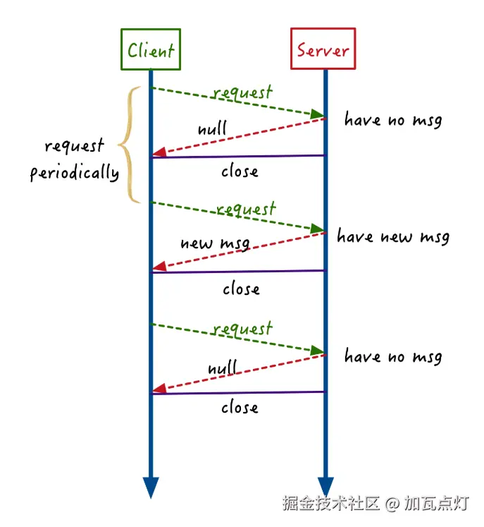 短轮询采用高频HTTP请求轮询服务端,其交互模型如下:
