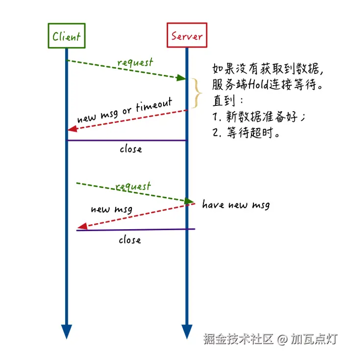 短轮询和长轮询之所以没法做到基于事件的完全的“边缘触发(当状态变化时,发生一个IO事件)”,这是因为服务端在有新消息产生时,没有办法直接向客户端进行推送。