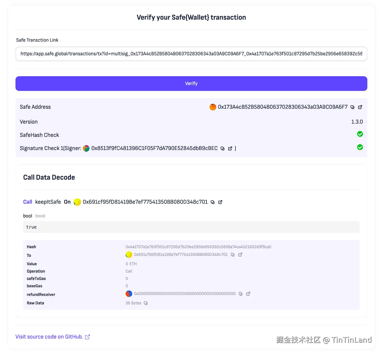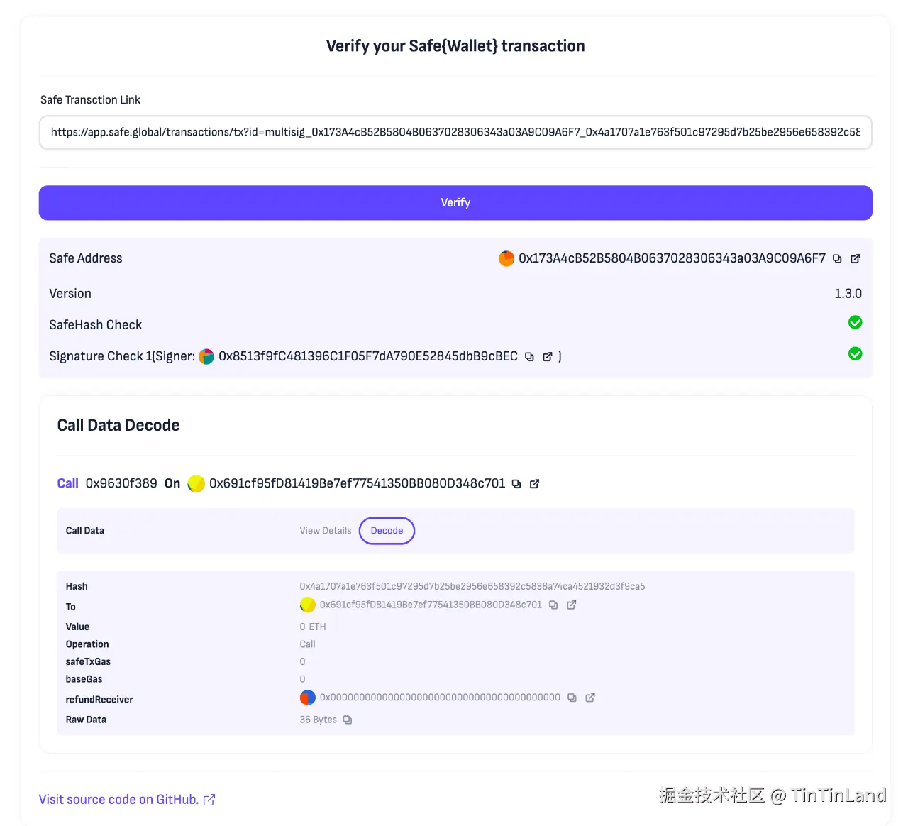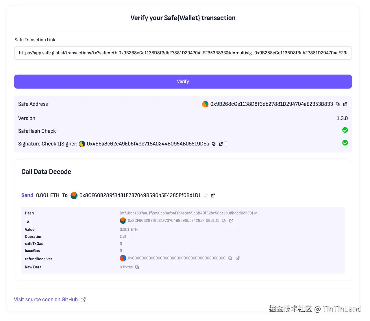 我们也对这个工具进行的验证。如图,只需要把 safe 页面里的交易分享链接粘贴进来,就可以自动读取 Safe 后端数据,并独立验证交易原文的哈希值和签名的正确性,简而言之如果确定图中的 calldata 解析是自己想要的交易,并且「SafeHash Check」和「Signature Check」验证通过,就可以认为「这是自己想发送的交易」并且「自己已经正确签名」了。