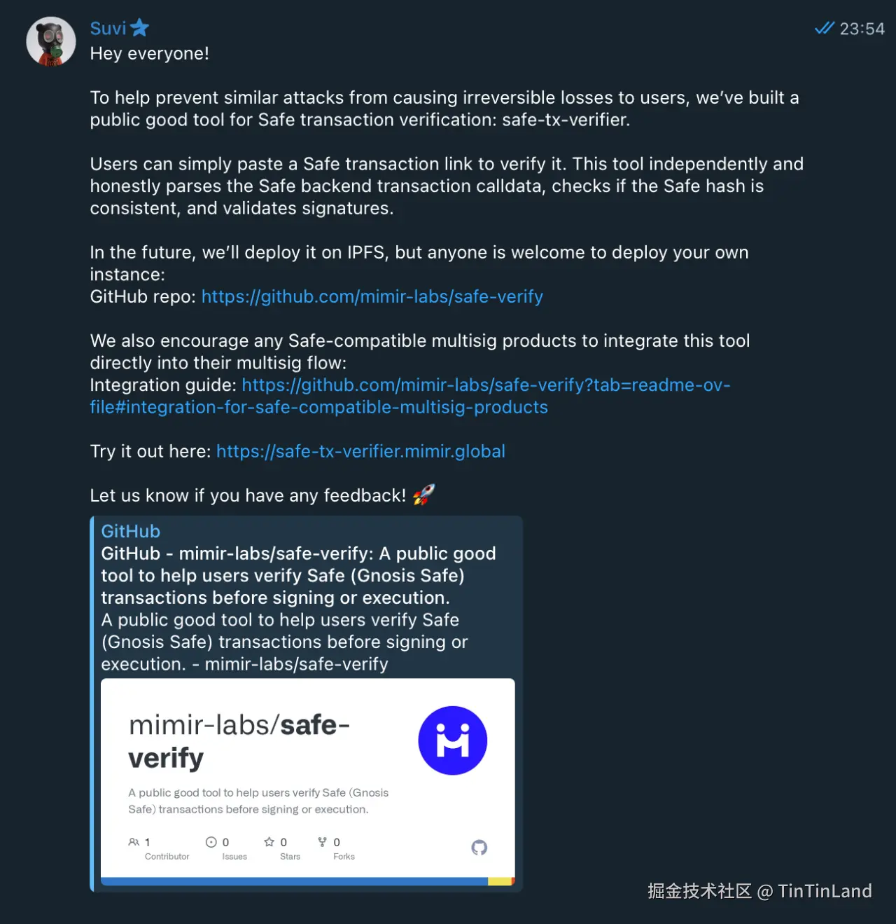 对于 Safe 前端攻击事件,社区的反应也很快,我们在 Safe 官方的 telegram 群里发现已经有人提供了独立的 Safe 交易解析工具,这种方式看起来更加简单直接。