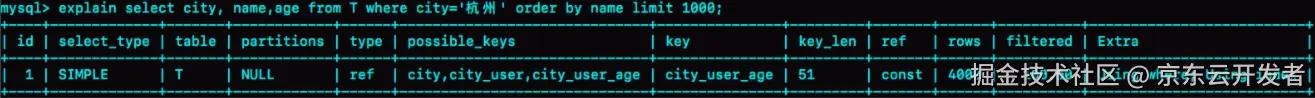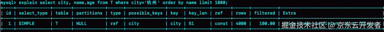 此时你已经很清楚,为了避免全表扫描,需要在city字段上加索引,我们用explain命令看一下这条SQL执行情况: