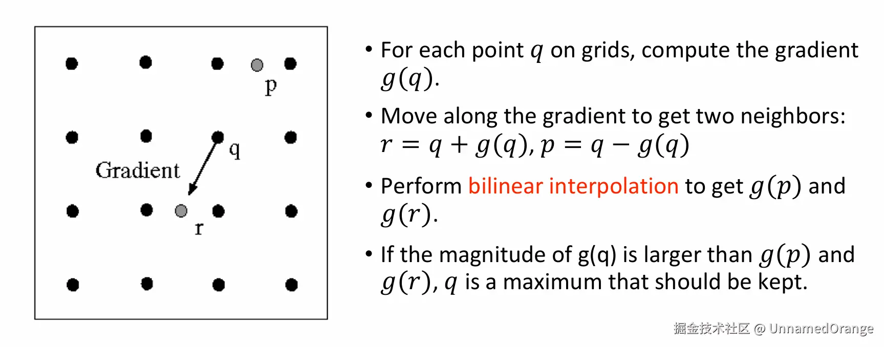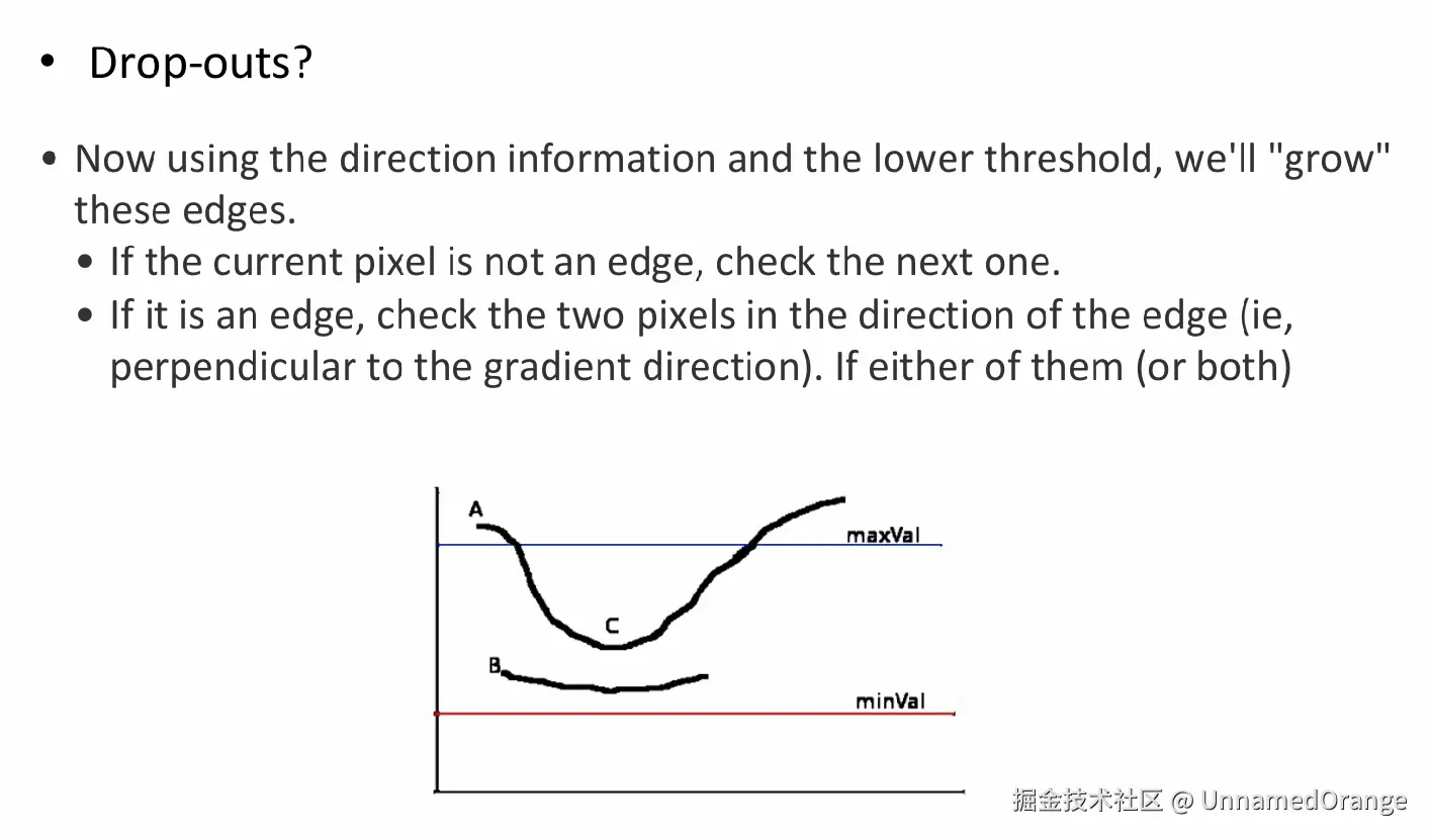 Canny 边缘提取 UnnamedOrange 2025-03-06 57 阅读1分钟 使用高斯滤波器进行低通滤波。 使用非极大值抑制,用双线性插值得到每个点沿梯度前后的点的梯度,排除梯度不是这三个点中最大的。 使用滞回的方法排除零散小点,从 maxVal 可以出发,到 minVal 必须截断。