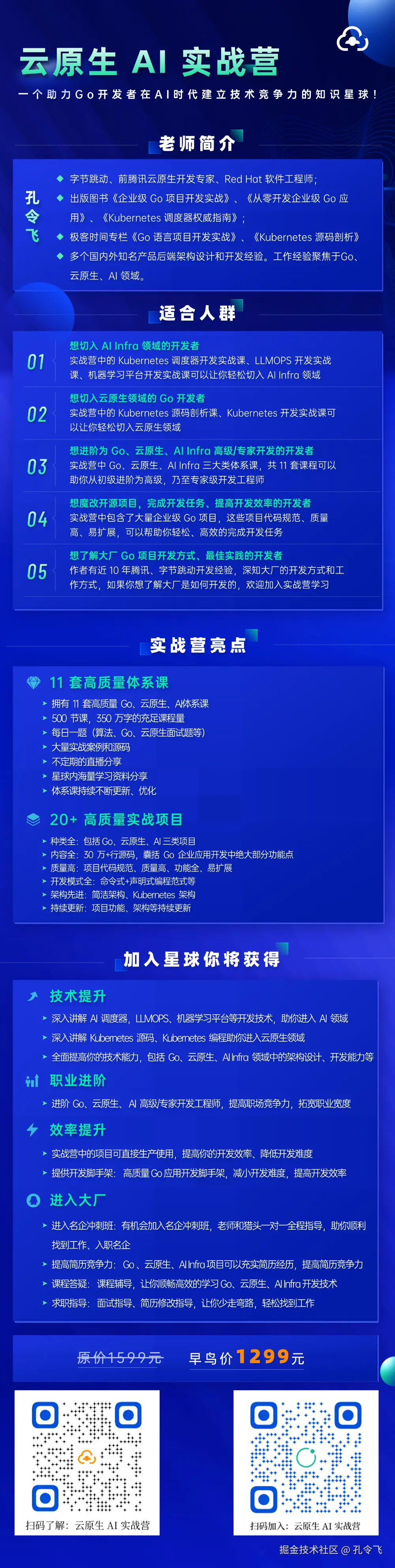 通过让 Go 开发者的工作岗位下移到云原生、AI Infra 领域,从而成为最难被淘汰的那批开发者。另外,云原生 AI 实战营中的课程和实战项目,具有很深的深度及广度,期望以此让 GO 开发者具备很高的技术壁垒,降低被替代的概率。