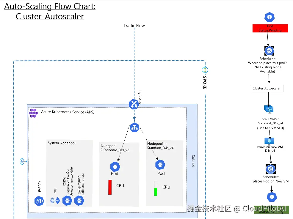 当新 Pod 需要部署但当前节点容量已满时,Cluster Autoscaler 会尝试创建新的节点,但只能基于现有 VMSS SKU 进行扩容。如果该类型的实例不可用,Pod 将保持待调度状态。