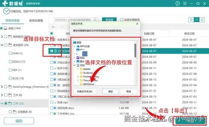 步骤2: 等待软件扫描结束后,自行在指定的位置上选择所需文件,点击【导出】;最后在【浏览文件夹】的弹窗中选择存放位置。