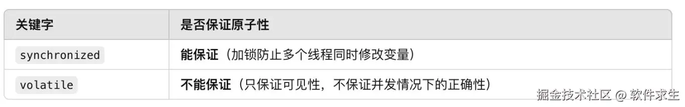 小米举例:“比如你有一个 count 变量,你可以用 volatile 让它的修改对所有线程可见。但如果你要保证 count++ 这个操作的原子性,那 volatile 就不行了,必须用 synchronized。”