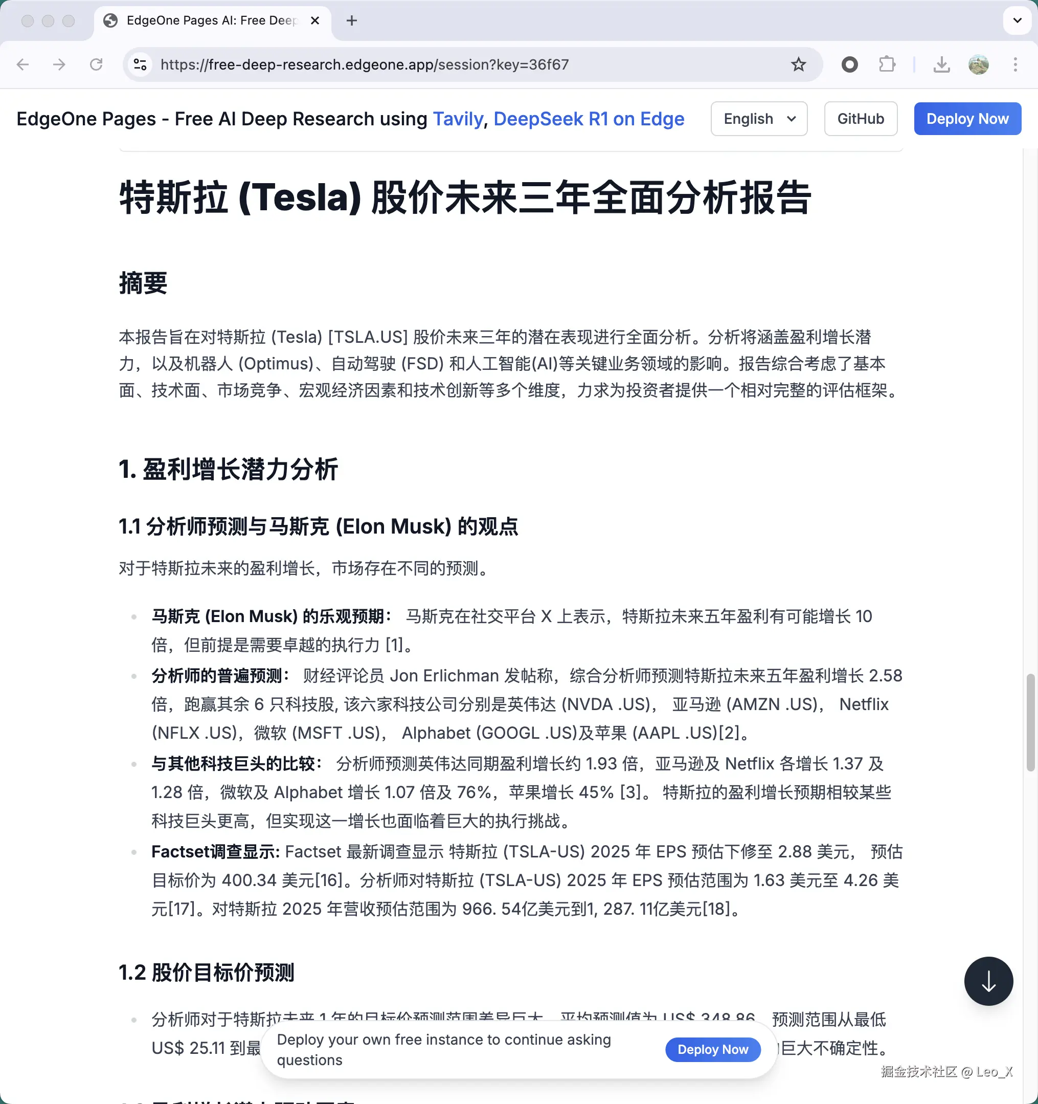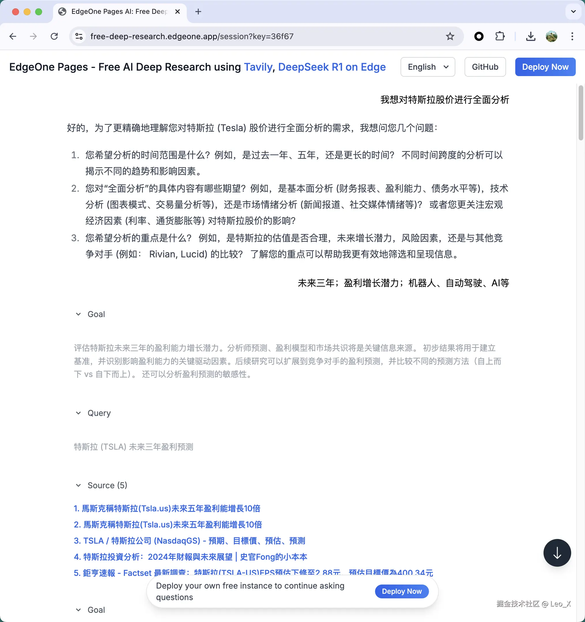 看到 EdgeOne Pages 有个模板有点意思,效果远不如 DeepResearch 那么详尽,但是提供了免费的边缘 AI 能力,可以随便调用 DeepSeek R1 模型,同时整合了 Tavily ,每月可以提供 1000 次免费的联网搜索。一个问题消耗 10 次检索算,差不多可以提供上百个问题。