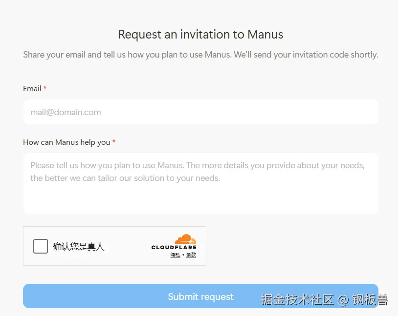 申请邀请码的方法很简单,只需填写邮箱并简要说明你使用Manus的需求。