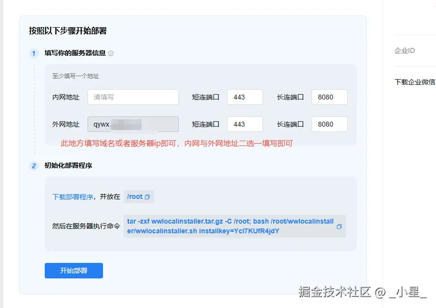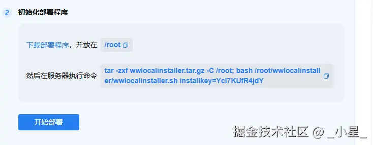 下载部署程序并且上传到服务器上。复制命令后,在服务器上执行,即可初始化部署程序。下载后获得部署程序文件,会获得一个wwlocalinstaller.tar.gz命名的文件