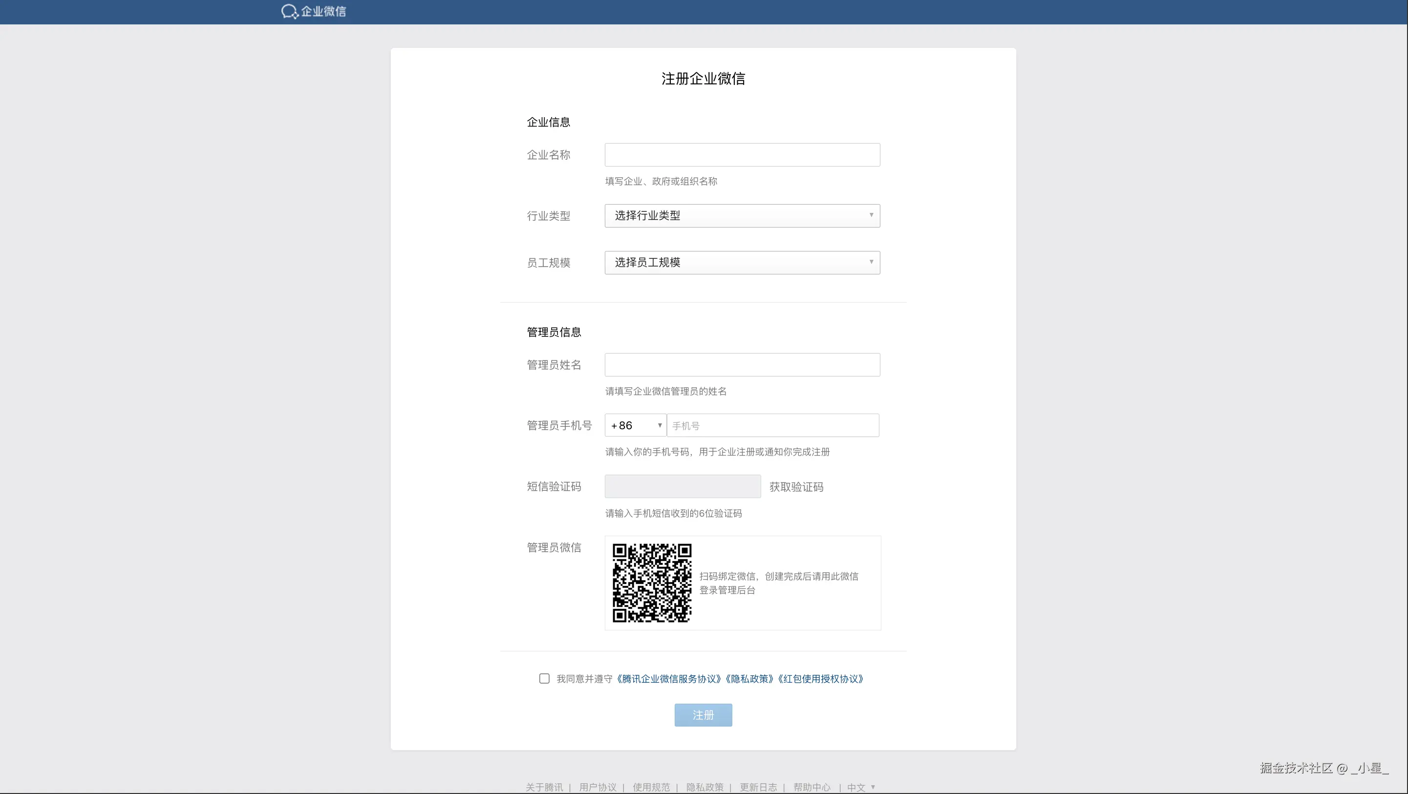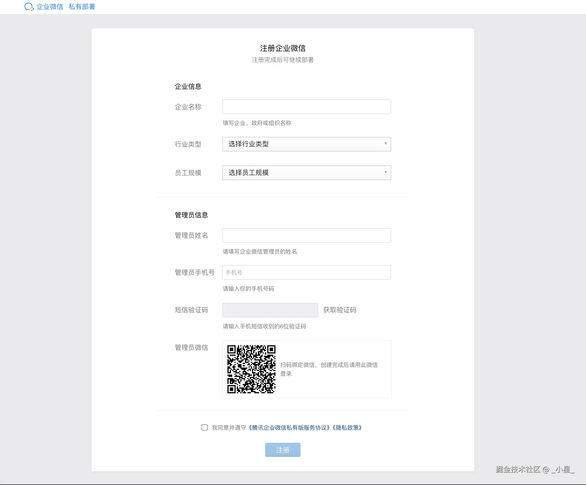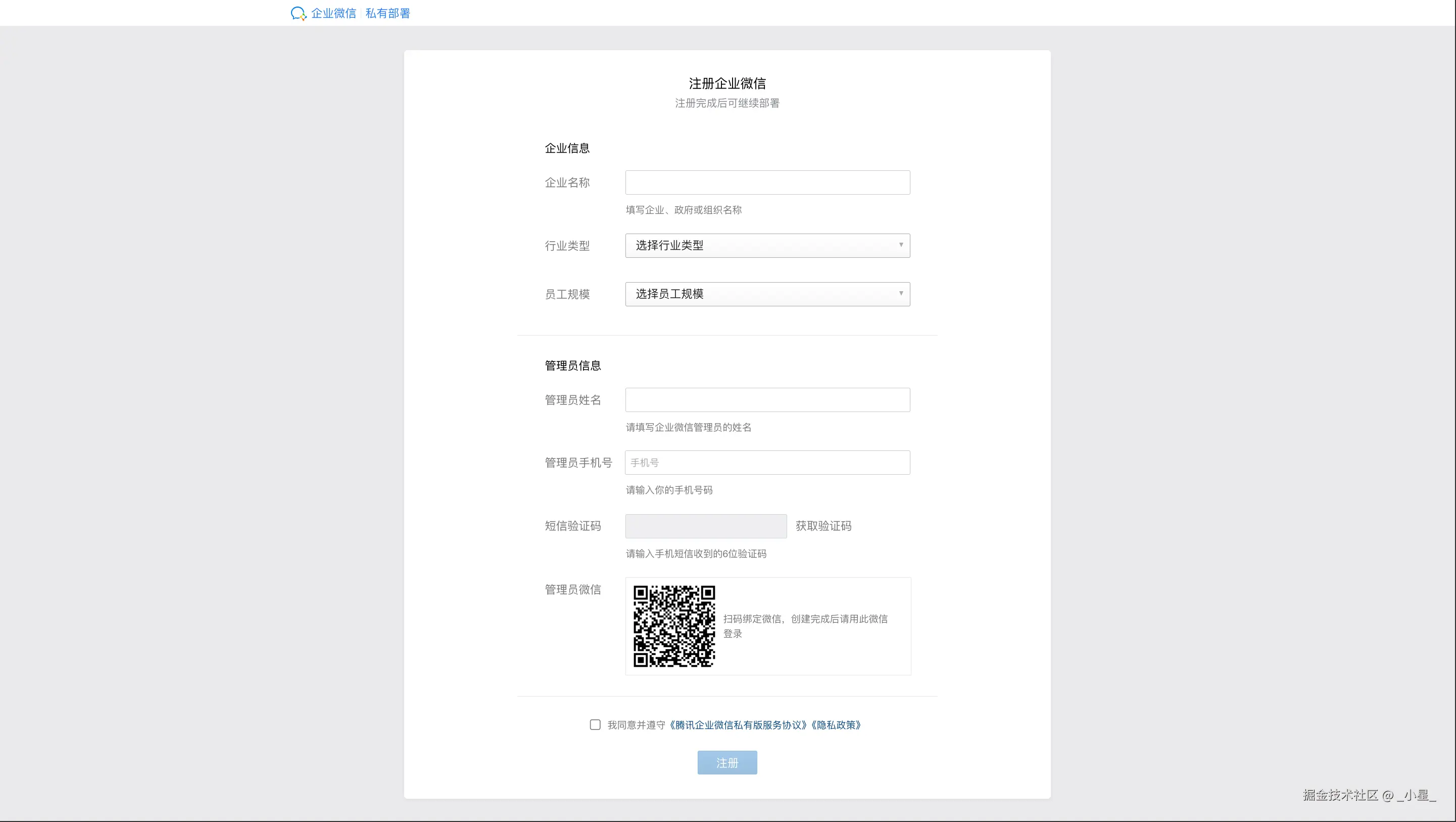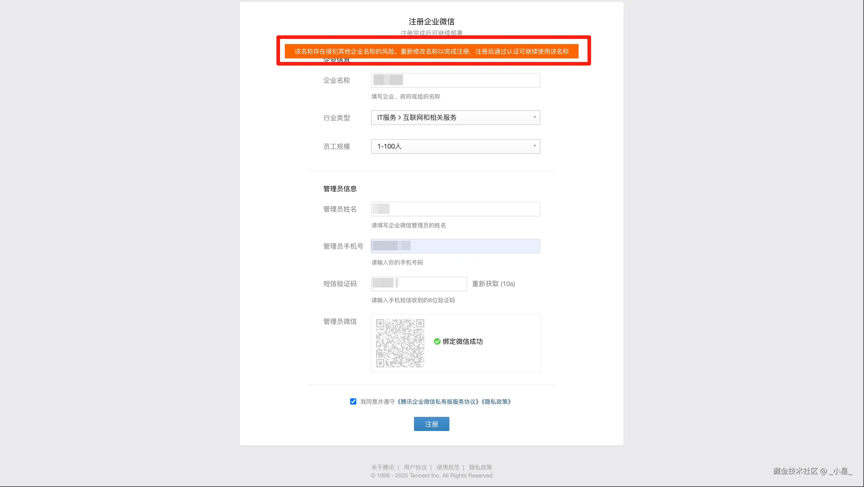 注:填写时需注意以下几点1.企业名称需使用未进行在saas企业微信中已经认证过企业名称(saas企业微信则是普通版本企业微信)2.管理员姓名,手机号,管理员微信需使用本人实名的手机号填写3.管理员微信与上方填下的手机号需和绑定的微信实名和手机号一致才可绑定