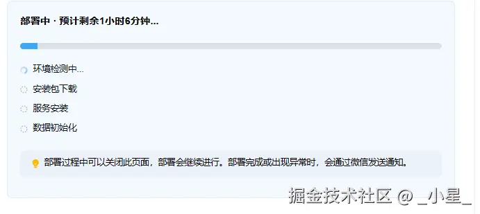 - 运行部署程序:下载完成后,按照部署程序的指引进行安装和运行。部署过程中,需要输入服务器的相关信息,如IP地址、端口号等。同时,根据部署程序的提示,逐步完成配置和初始化工作。一般情况下,整个部署过程需要60分钟左右。