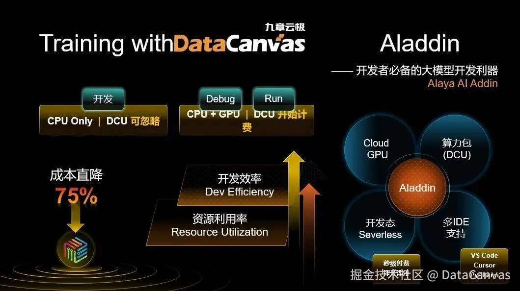 在大会论坛上,九章云极DataCanvas公司AI首席科学家缪旭博士受邀发表主旨演讲。他表示,“算力不应是少数企业的‘奢侈品’,而应成为开发者触手可及的‘日用品’。借助我们的大模型开发工具Aladdin,九章云极DataCanvas赋能开发者无缝使用云端GPU算力,一键开启大模型的远程开发、调试和微调,算力使用成本直降75%,实现开发效率和资源利用效率的双效突破。”