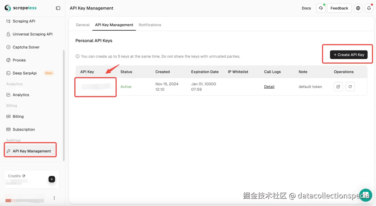 在您的Scrapeless控制面板中,导航到API密钥管理,然后单击创建API密钥。您将获得您的API密钥。只需将鼠标放在上面并单击即可复制它。在调用Scrapeless API时,此密钥将用于验证您的请求。