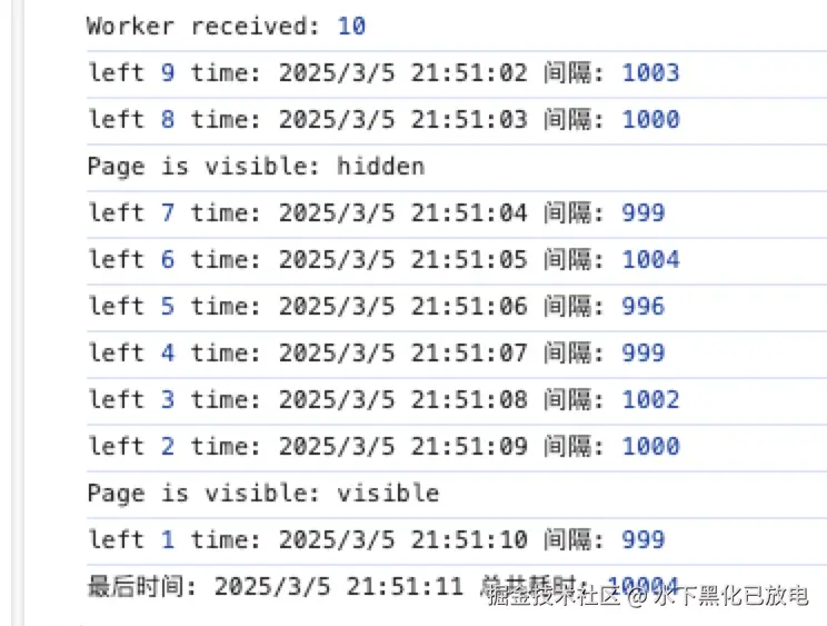 原因:当页面处于后台时,浏览器会降低定时器的执行频率以节省资源,导致 setTimeout 的延迟增加。切回来后又正常了