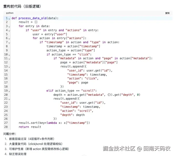 “从复杂嵌套的 JSON 数据中提取用户行为数据,并按时间排序后生成报表。原始数据包含大量冗余字段,且存在嵌套层级过深的问题。”