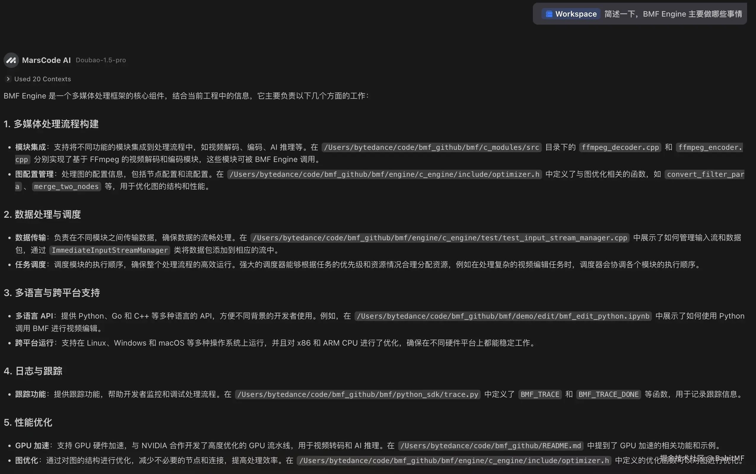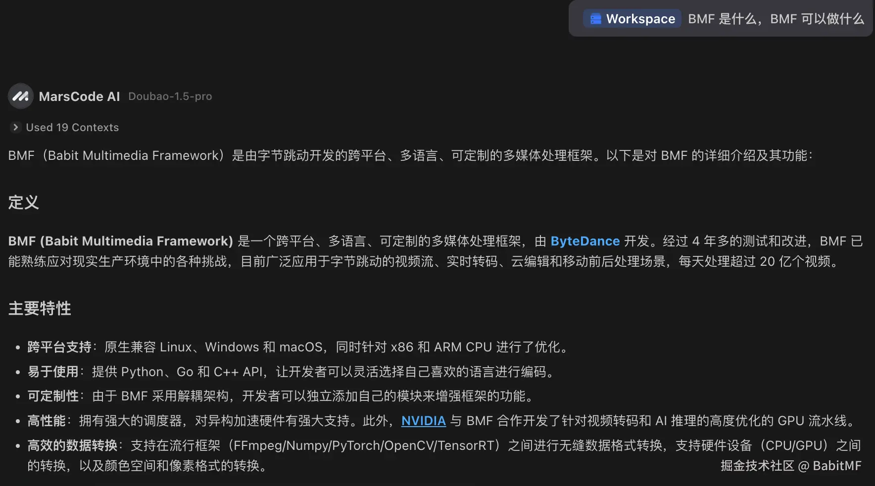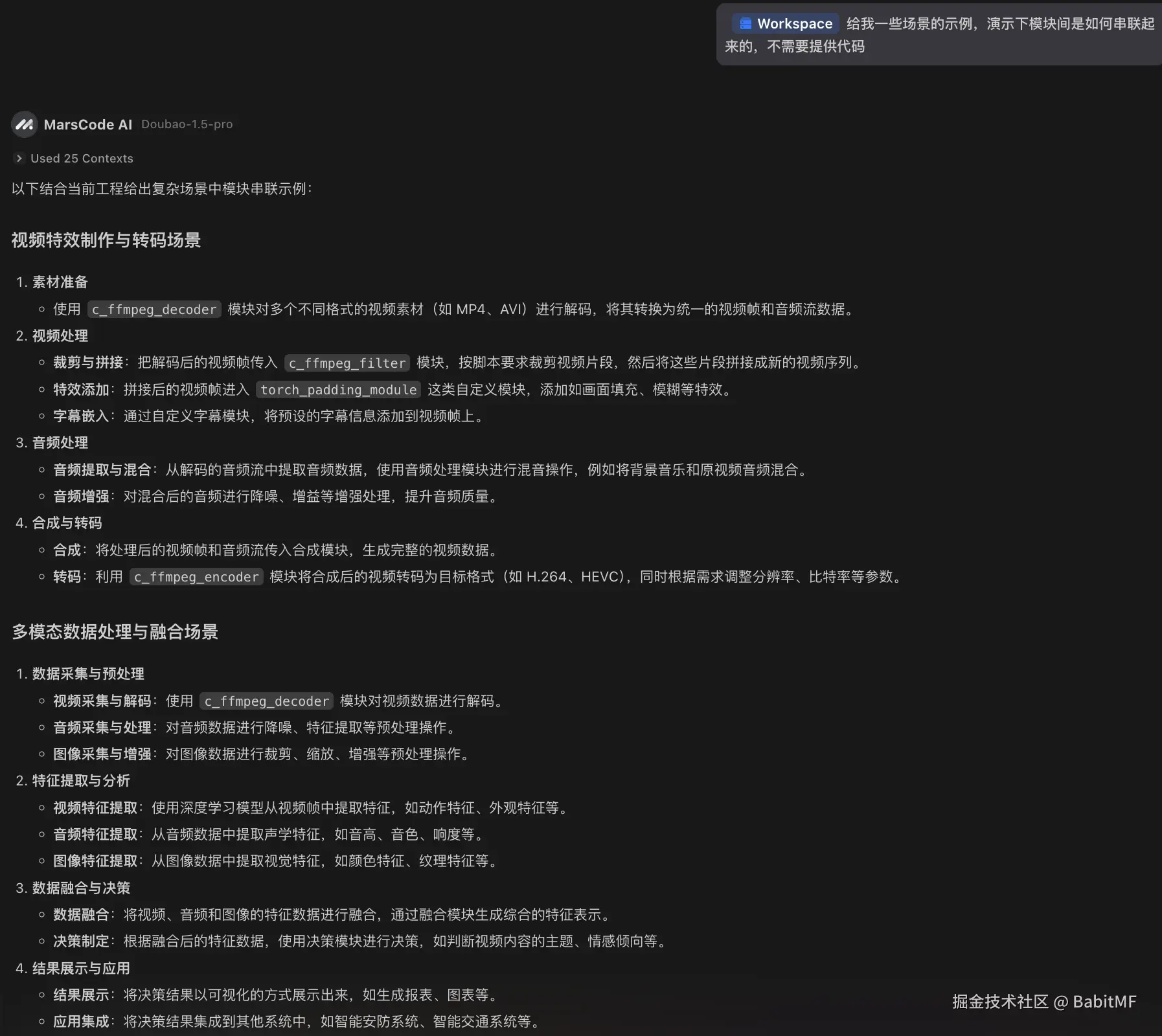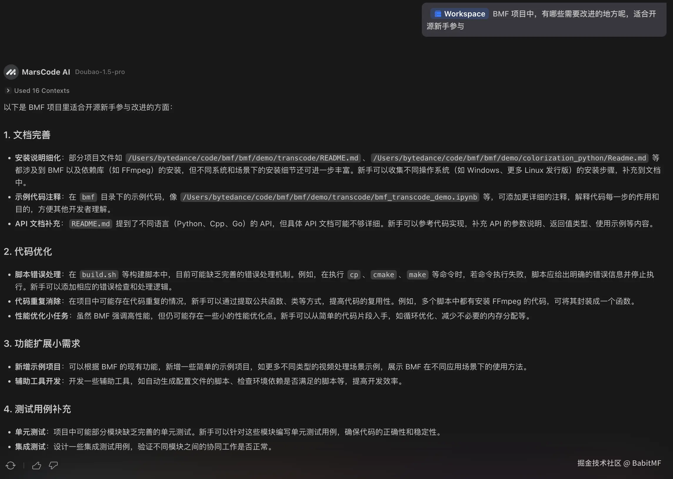 借助先进的 workspace 理解能力,Marscode 能够更智能、更精准地解答开发者的问题。 Git clone BMF 项目后,只需要在 VSCode 中下载 Marscode 插件,就能拥有一位专属的 BMF 导师,为你提供全方位的指导。