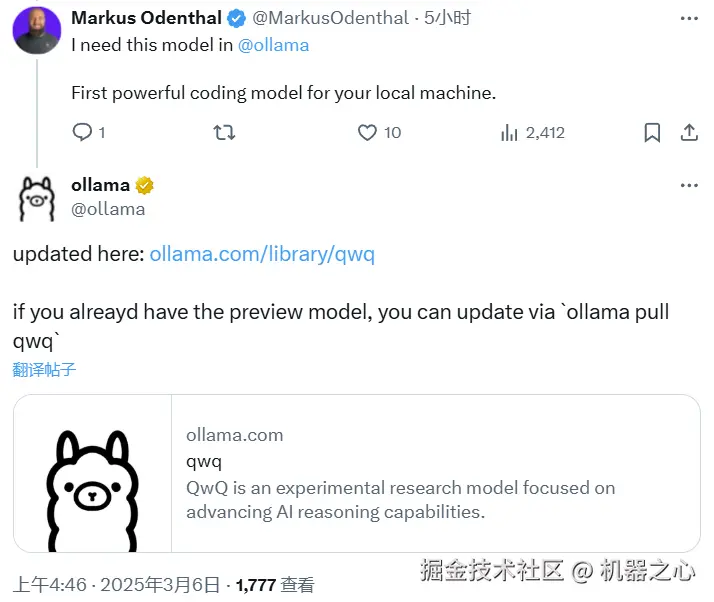 本地部署工具 Ollama 也第一时间提供了支持:ollama run qwq