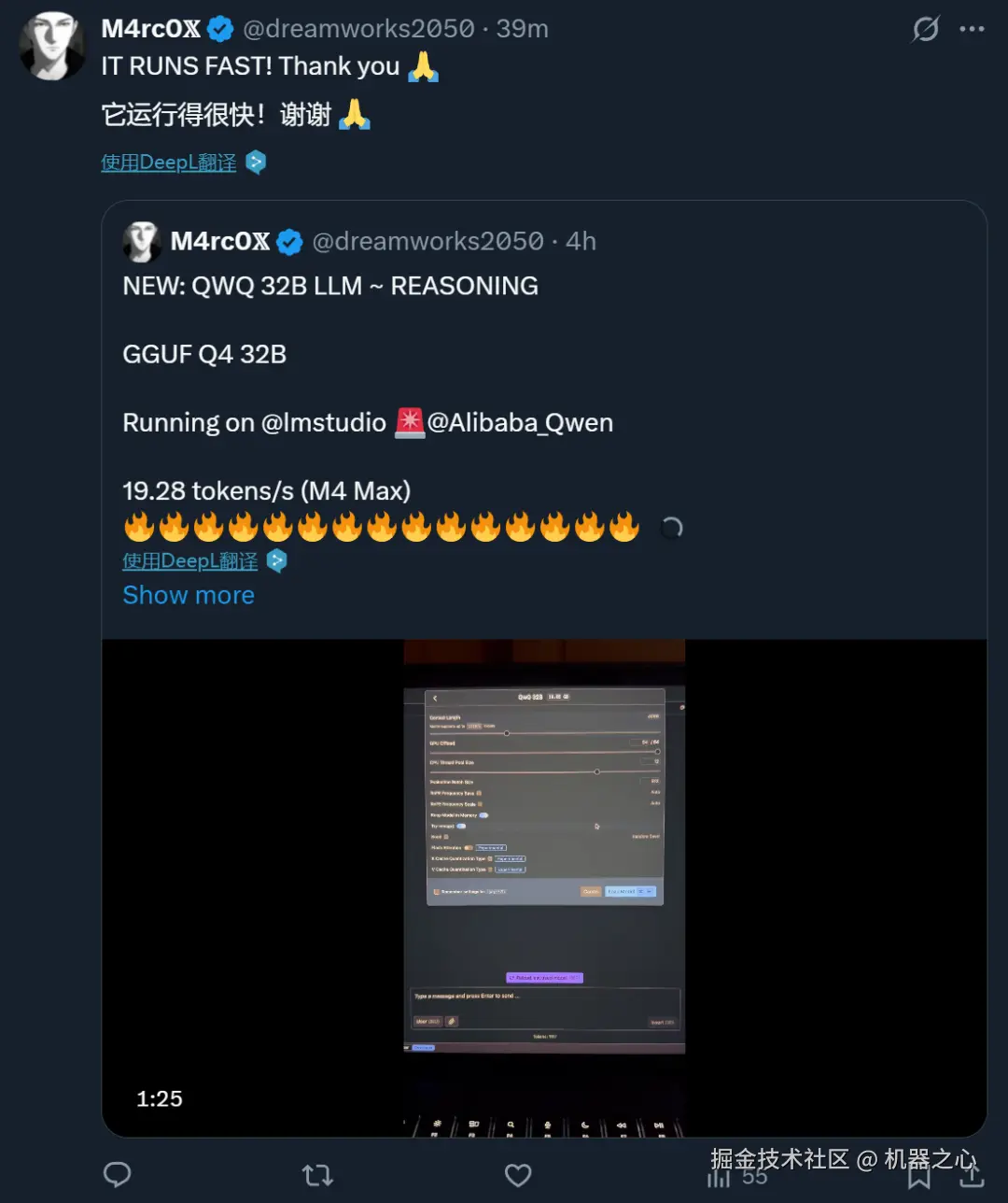 苹果机器学习研究者 Awni Hannun 也同样已经在 M4 Max 上成功运行了 QwQ-32B,看起来速度非常快。