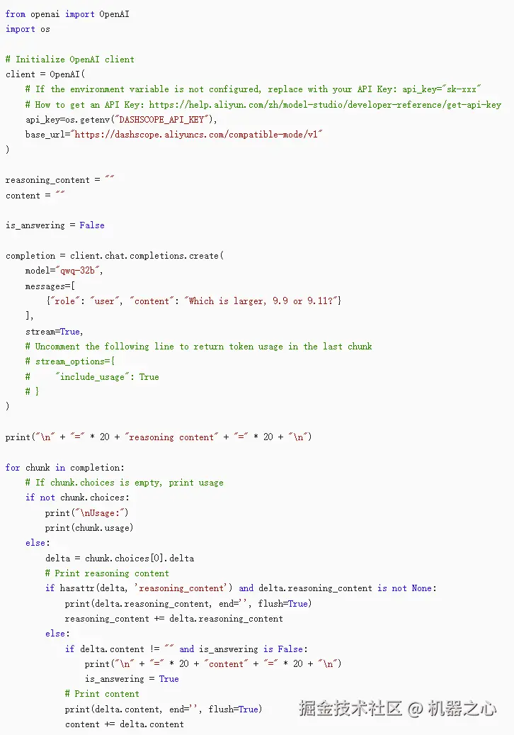 如果你想通过 API 使用 QwQ-32B,可以参考以下代码示例: