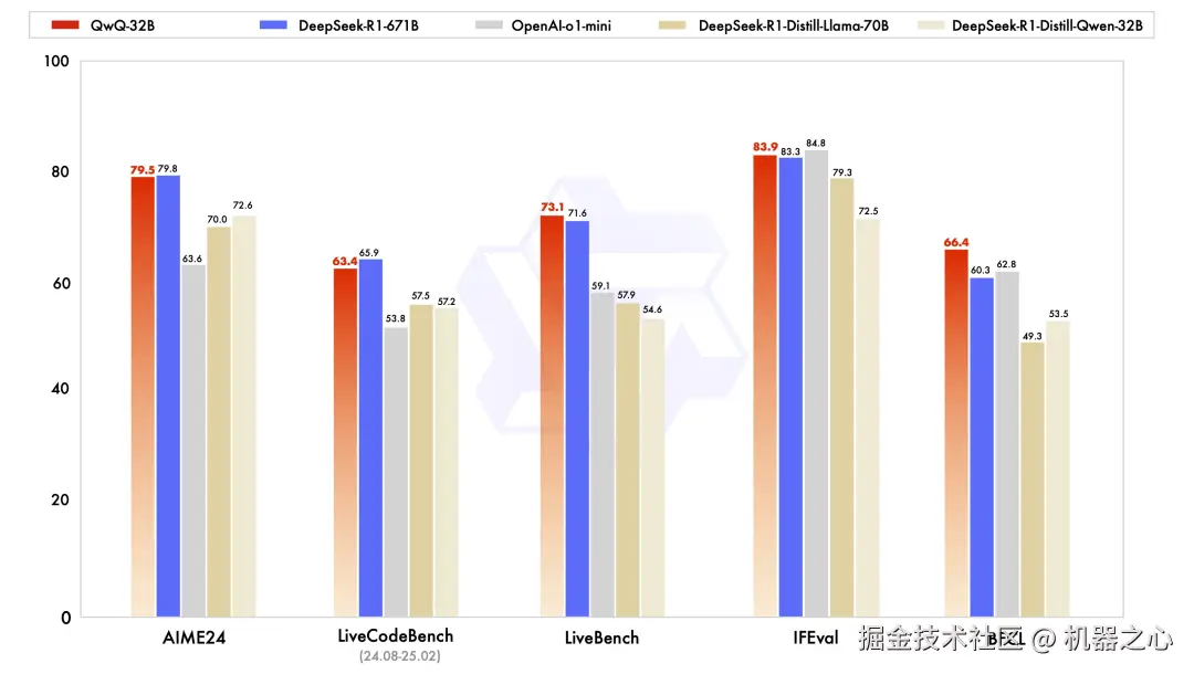 可以看到,QwQ-32B 的表现非常出色,在 LiveBench、IFEval 和 BFCL 基准上甚至略微超过了 DeepSeek-R1-671B。