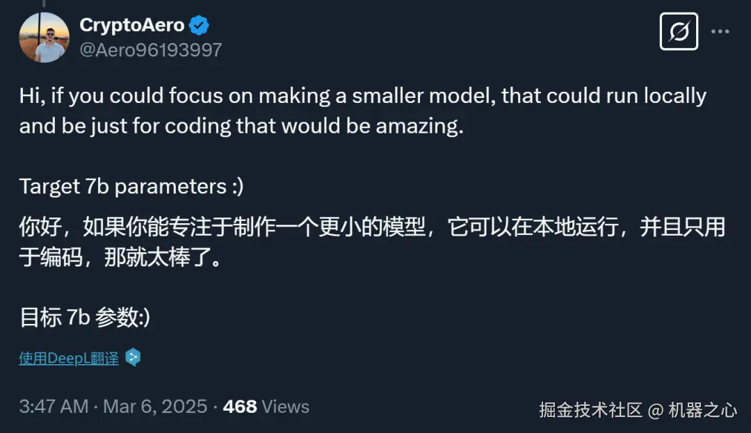 还有人喊话阿里巴巴通义实验室科学家 Binyuan Hui 去做更小的模型。