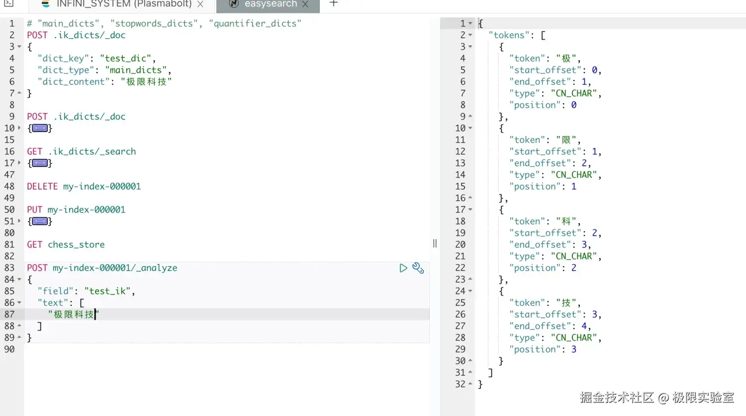 在整体使用上,ik 自定义词库的设计是比较灵活的,用户不仅可以通过分词器设置,自由的应用到各个字段。存储词典的方式也从固定文件和远程连接修改成了读取本地集群中默认的词库索引,减少了自定义词库的配置成本。当然,这个词库索引也可以由用户自定义,只要能和默认的词库索引保持一样的结构就好。