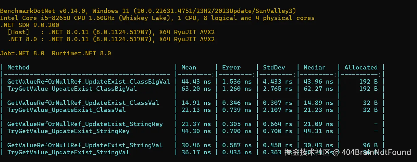 GetValueRefOrNullRef:仅需一次哈希计算获取引用,后续直接操作内存,无额外开销。TryGetValue:TryGetValue和dict[key] = value分别计算哈希,导致两倍性能损耗。