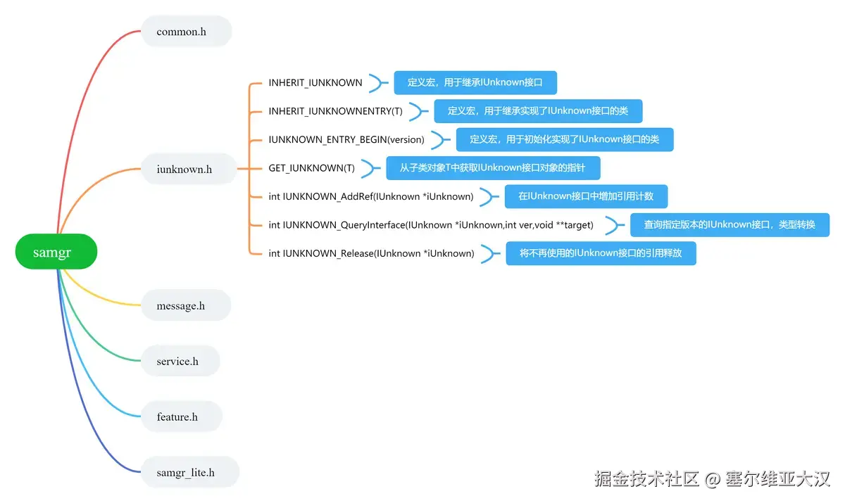 iunknown.h为系统能力的外部功能提供基类和默认实现。主要接口的思维导图如下。