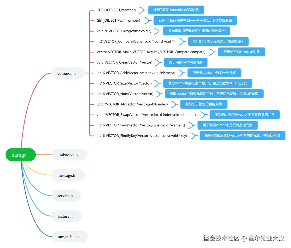 二、分析 首先分析最基本的common.h,这部分提供了Samgr和外部模块的常用对象和函数。主要接口的思维导图如下。