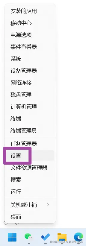 首先,在开始菜单上右键,选择“设置”,如下图所示。