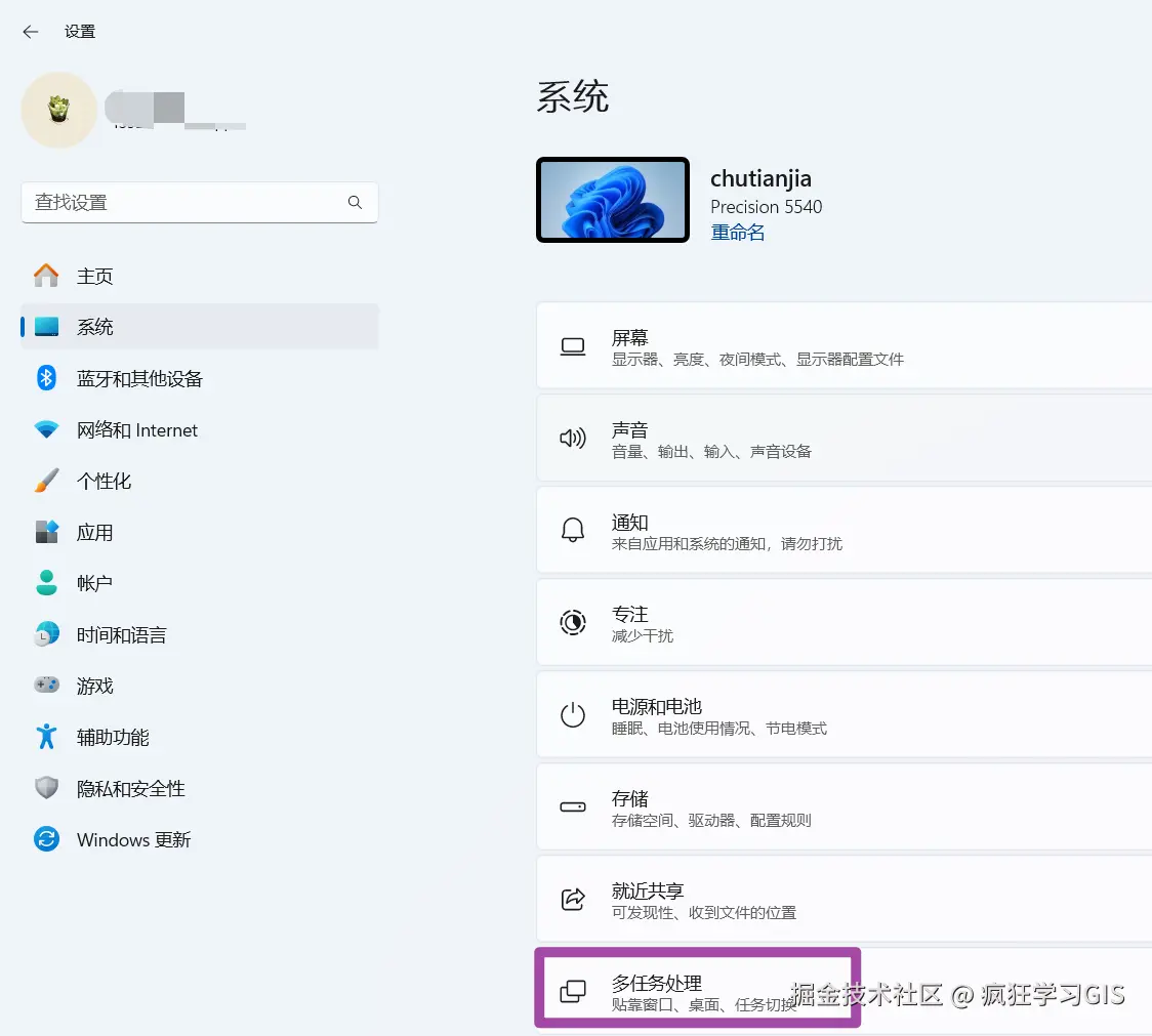 随后,选择左侧的“系统”,然后选择其中的“多任务处理”,如下图所示。