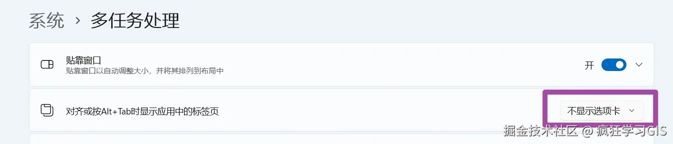 随后,找到其中第2项,也就是带有Alt与Tab字样的那个选项,将其设置为“不显示选项卡”,如下图所示。